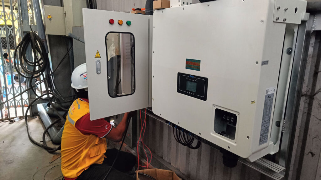 Trung tâm xử lý chuyển hóa nguồn năng lượng mặt trời là inverter Đê dê 80kW 3 pha, cho khả năng vận hành ổn định, bám tải thông minh, giúp giảm đáng kể chi phí điện hàng tháng mà không ảnh hưởng đến hoạt động sản xuất.