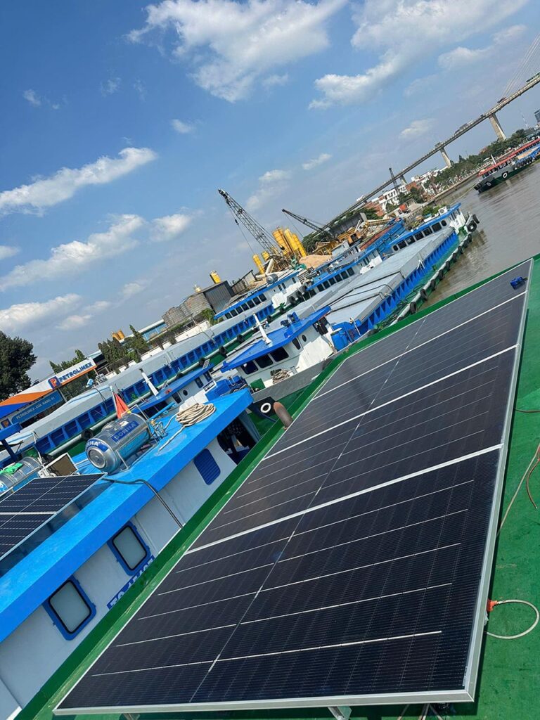 Việc áp dụng năng lượng mặt trời trên các phương tiện vận tải, đặc biệt là tàu, sàlan đi sông, đang trở thành một xu hướng phổ biến nhờ tính hiệu quả và thân thiện với môi trường. Một hệ thống điện mặt trời đã được hoàn thiện để cung cấp điện cho một sàlan đi sông, bao gồm 4 tấm pin năng lượng mặt trời 585W, một inverter LuxPower 5kW, và pin lưu trữ SVSbattery 5kWh. Hệ thống không chỉ giúp sàlan hoạt động ổn định mà còn mở ra cơ hội khai thác năng lượng sạch hiệu quả trên sông ngòi.
