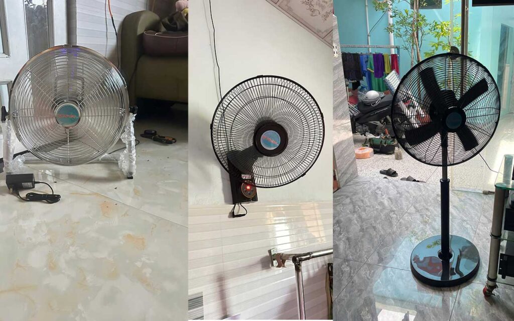 SV Solar hiện đang cung cấp ba mẫu quạt chính: quạt chân quỳ 25W, quạt treo tường 25W, và quạt đứng công nghiệp 30W. Cả ba loại đều sử dụng điện từ tấm pin mặt trời để hoạt động, không phụ thuộc vào điện lưới. Với khả năng hoạt động liên tục từ 6–10 tiếng tùy theo ánh nắng và dung lượng pin, quạt năng lượng mặt trời không chỉ phù hợp với gia đình, mà còn rất hữu ích cho các cửa hàng, quán cà phê ngoài trời, hoặc các khu vực thường xuyên mất điện.