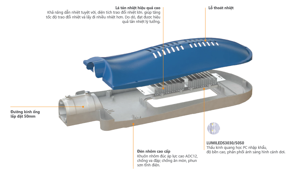 - Công nghệ chiếu sáng LED: Chip LED 5050 đạt hiệu suất ánh sáng ≥130 lm/W, cao hơn nhiều so với đèn sodium truyền thống (~80 lm/W).