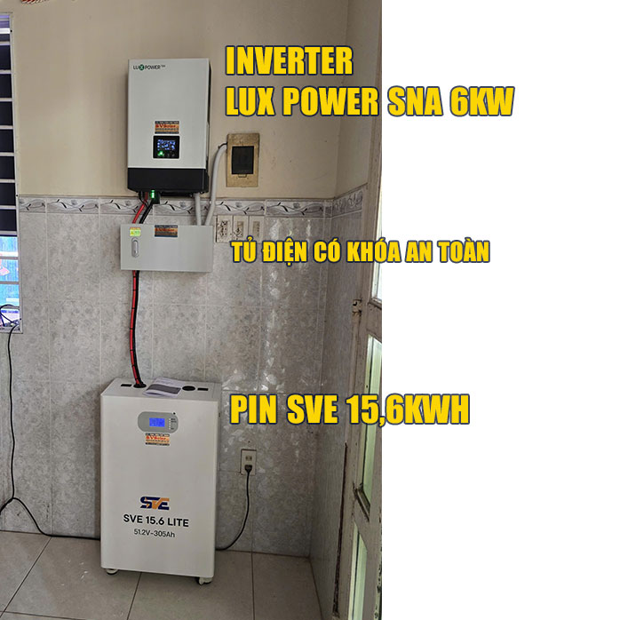 Pin Lithium SVE 15,6kWh – dung lượng lưu trữ lớn, giúp gia đình anh Tài có thể sử dụng điện vào buổi tối hoặc khi mất điện, mang lại sự an tâm tuyệt đối.